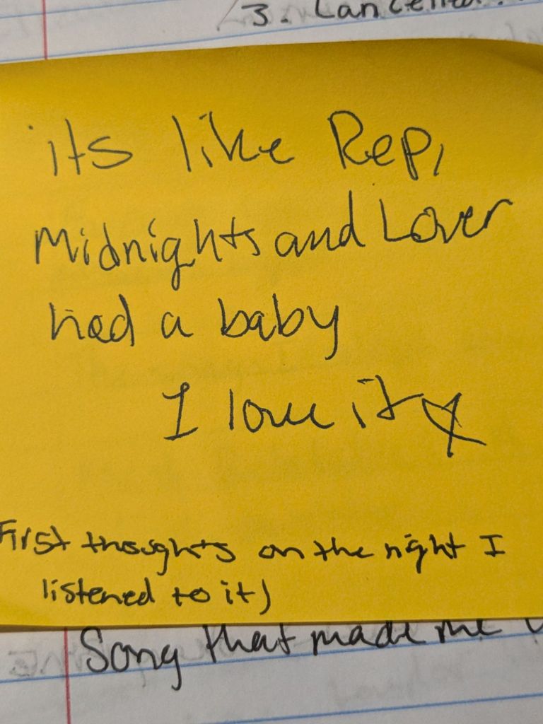 To be honest with you all it took me a day or two to listen to the album, I usually listen to the album the night it releases but I had a lot going on the week of the release. But when I finally did listen to the album I had to sit with my emotions – so many emotions. How does she always hit us with such bangers? Seriously though, the album and I will insert a picture of the note below, “it’s like rep, midnights and lover had a baby – I love it”.