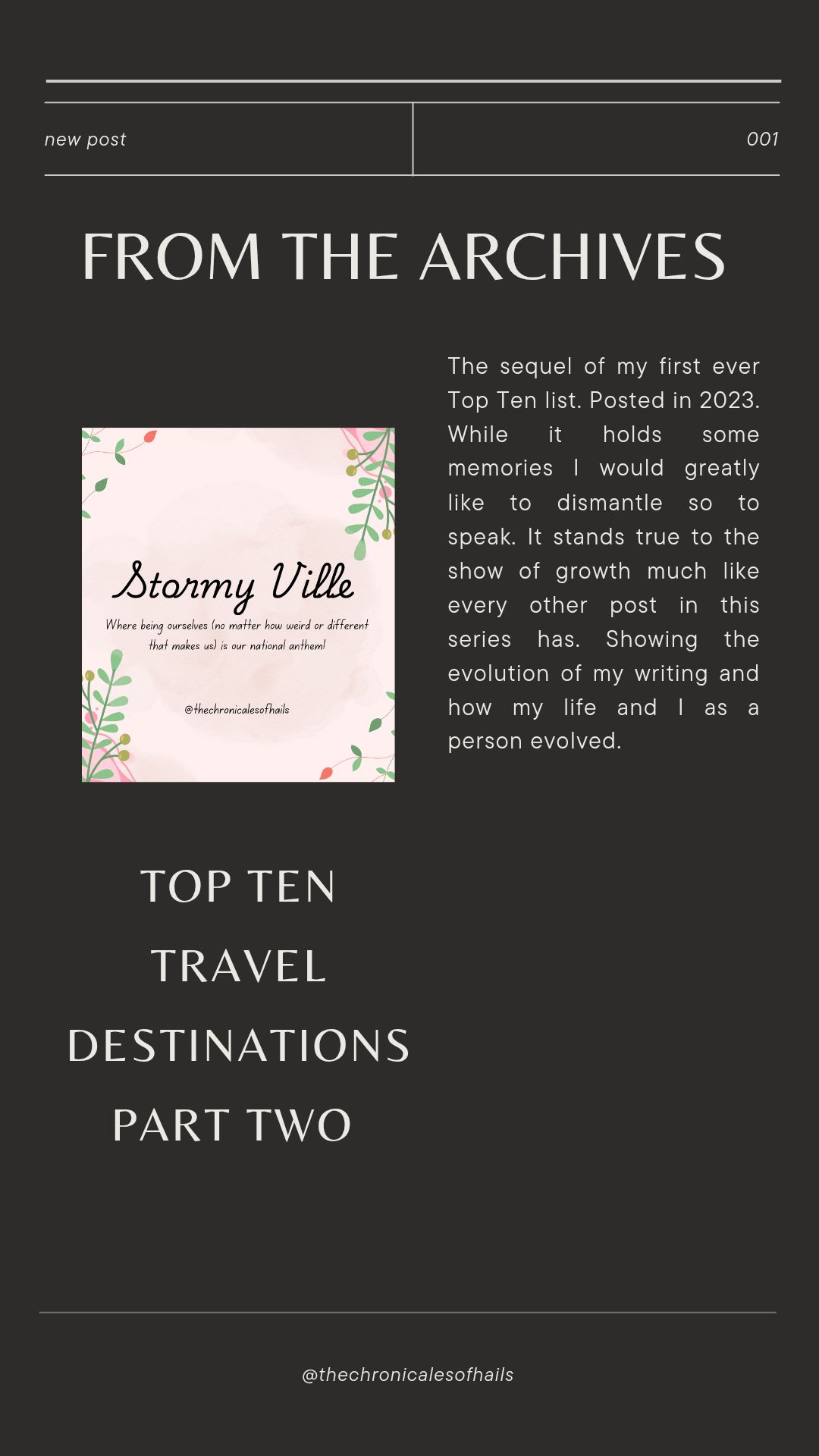 Hello and welcome back to another stormy day or night (whenever you’re reading this) in the shire. I hope tea is warm and your blanket is cozy! I can’t wait to share with you all another file from the archives. (Cheeky I know, believe me it’s better than the intro you’re about to read) yes you heard that right, you’re getting two introductions. For today you’re getting the second part of Travel Destinations. So without further ado!