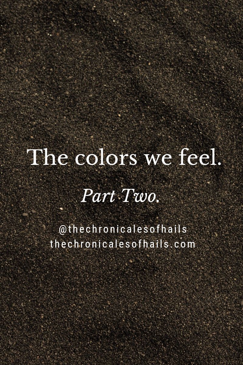 Picking up where we left off I’ll be answering 5-9 in today’s part. Honestly I think “The Colors We Feel” could be like a therapy Wednesday thing. I like having everything have its own day… I know says the girl who can’t keep up with a schedule for the life of her. But it just feels right? It’s a simplistic post yet so intriguing – at least to me. Also a quick little side note before we get into the questions. It feels like everything is a mess a disaster but I can feel it all slowly falling into a place where it fits if that makes sense? Specifically when it comes to Stormy Ville. That feels important.